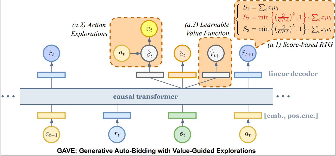 針對這些挑戰,快手提出了GAVE和CBD兩大創新算法。GAVE算法融合了Score-based RTG機制與價值函數引導的動作探索策略,顯著提升了離線訓練中的探索能力,該成果助力團隊榮獲NeurIPS 2024自動出價競賽雙賽道冠軍。