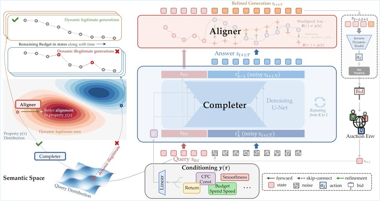 CBD算法則聚焦于生成模型與優化目標的對齊問題,引入“Completer(擴散補全)”和“Aligner(偏好對齊)”雙模塊,通過補全未來狀態軌跡并進行校準,使出價策略更貼合廣告主真實需求,提升了系統長程規劃與決策可解釋性。