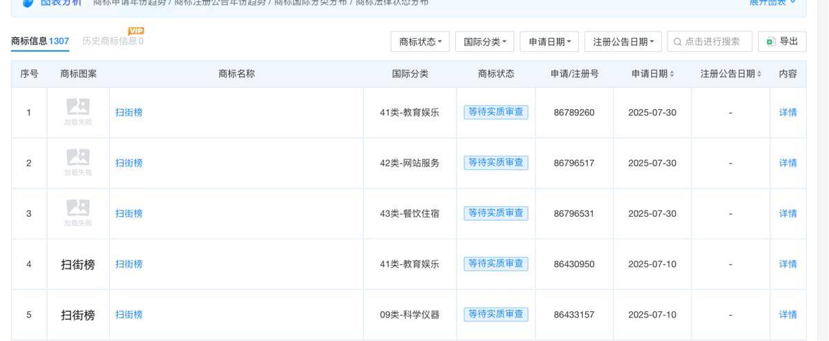 天眼查APP商標信息顯示,到今年7月份,高德才申請了“掃街榜”的多項商標。