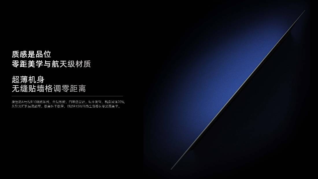 R10觀感系列不僅在功能上追求松弛,更在外觀設計上實現(xiàn)美學與實用的統(tǒng)一,讓電視成為家居風格的加分項。其采用四等邊設計與純平美背,機身厚度較傳統(tǒng)電視減薄20%,以≤60mm的超薄尺寸實現(xiàn)無縫貼墻效果。相較于普通藝術電視>120mm的“厚重小書包”機身,R10徹底打破了設備與墻面的視覺割裂感,無論是現(xiàn)代簡約風還是輕奢風家居,都能自然融入,營造電視即裝飾的格調(diào)。機身選用航天級鈦合金材質(zhì),集優(yōu)質(zhì)、美觀、耐用于一體,每一塊面板、每一條線條都彰顯高級感。內(nèi)部搭載航發(fā)級涵道散熱系統(tǒng),既保障設備長期穩(wěn)定運行,又能有效省能省耗,兼顧顏值與實用性,讓用戶無需擔心設備易損壞、能耗高等問題,進一步強化使用松弛感。