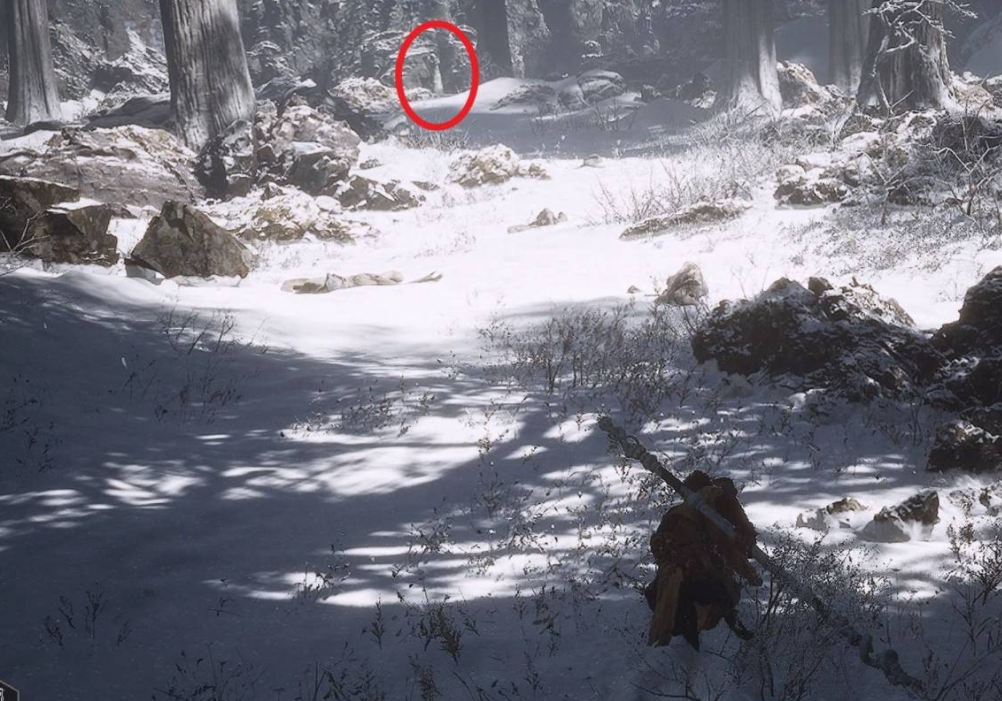參考下圖,沿路走到下圖所示位置附近時,前方大石頭上(紅圈位置)會出現一只隼居士。