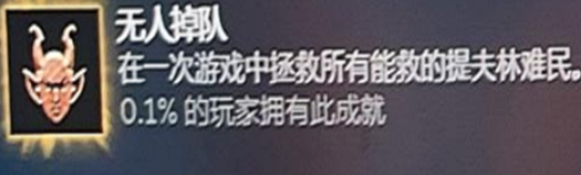 1、游戲中有很多成就都比較難以完成,無人掉隊就是其中一個,無人掉隊是在一次游戲中拯救所有能拯救的提夫林難民。