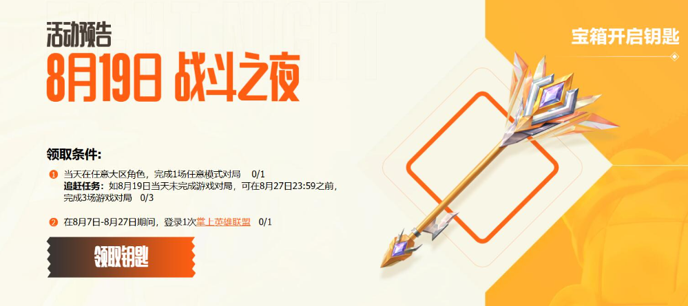 4、8月19日的戰斗之夜,玩家當天在任意大區角色,完成1場任意模式對局,如8月19日當天未完成游戲對局,可在8月27日23:59之前,完成3場游戲對局,且在8月7日-8月27日期間,登錄1次掌上英雄聯盟即可領取寶箱鑰匙;