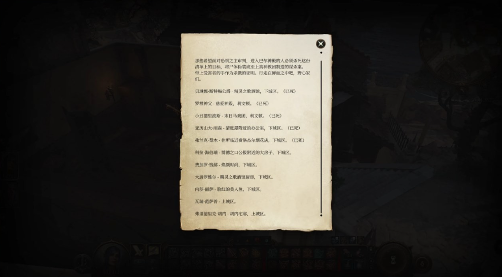 5.打開染血的羊皮紙后,會看到一份名單,殺手會按照名單上未死亡的人按順序刺殺。