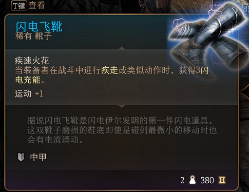 效果:當(dāng)裝備者在戰(zhàn)斗中進(jìn)行疾走或類似動(dòng)作時(shí),獲得3閃電充能。