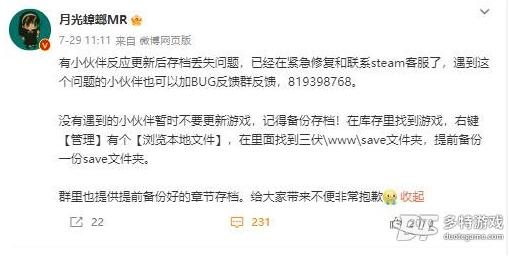 有小伙伴反應更新后存檔丟失問題,已經在緊急修復和聯系steam客服了,遇到這個問題的小伙伴也可以加BUG反饋群反饋,819398768。