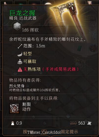巨龍之握近戰武器想要獲得只需要去德魯伊營地商人艾隆處購買即可,這個武器還有烈火焚身特效,可以對燃燒目標造成額外1d4揮砍傷害。