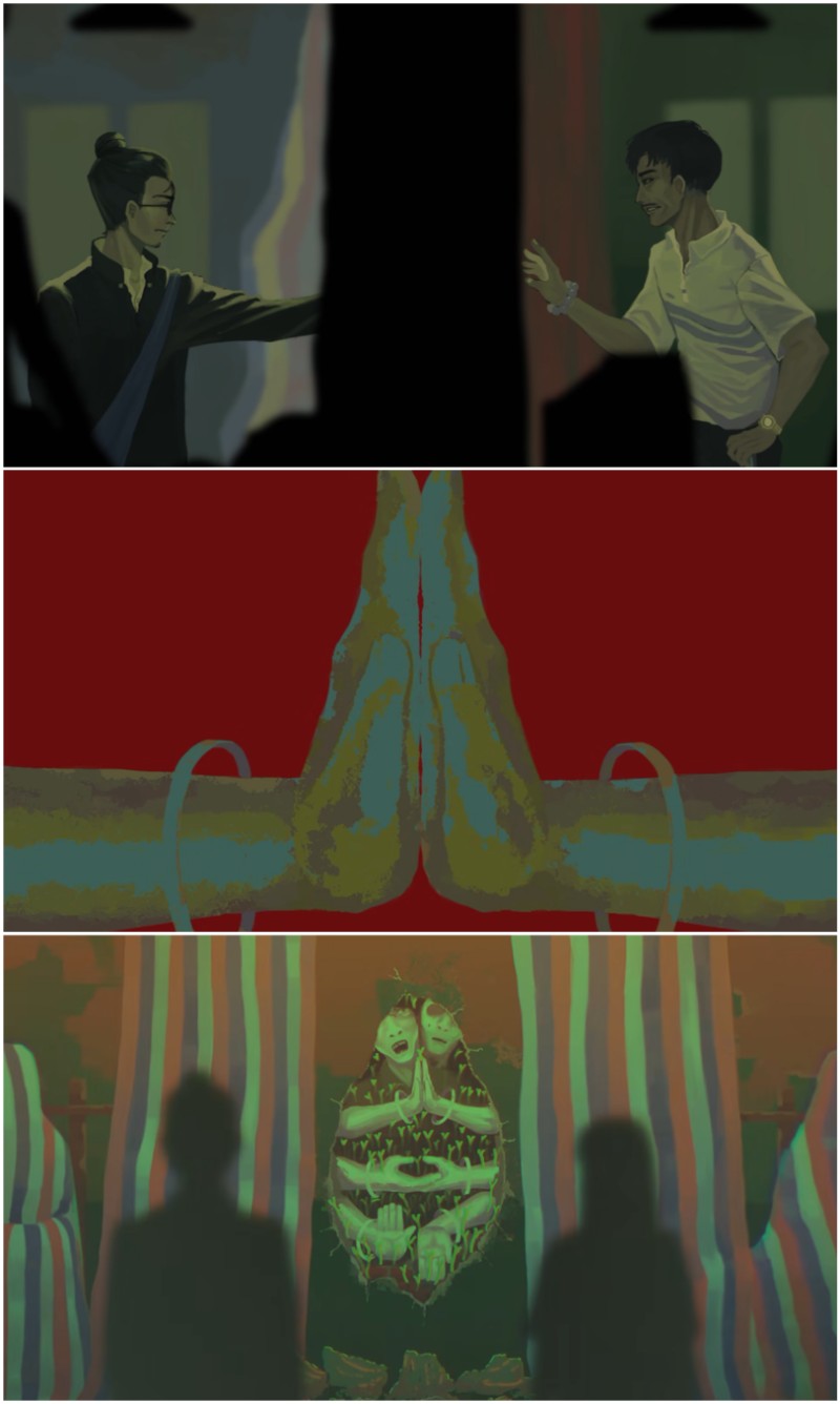 當(dāng)電視背后的墻面破裂,徐清源伸出手去,試圖碰觸裂縫背后的黑暗時(shí),黑暗處,王總也伸手向著光明推來(lái),兩只手碰到一起,卻分明是佛祖合十的雙手。