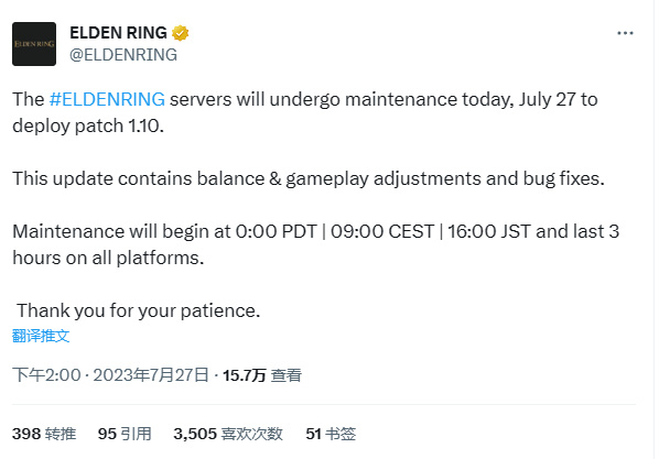 《艾爾登法環》于北京時間15點開始維護,之后將升級為1.1版本。
