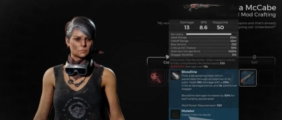 無情長槍屬性:傷害13、每秒彈數8.6、彈匣50。理想范圍20m、衰減范圍45m、最大彈藥量250、暴擊幾率10%、弱點傷害加成+100%、硬直改裝0%。無內置突變因子。