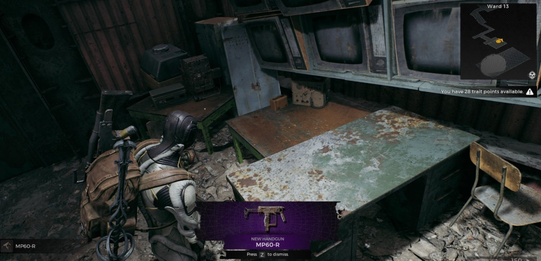 開(kāi)門(mén)進(jìn)入房間,桌子上可以拾取MP60-R。