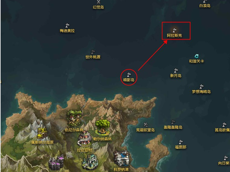 3、找到靠近伯尼爾岸邊的暗影島,暗影島的東北方向便是阿拉斯克島。