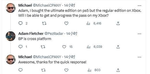 用戶MichaelCPANY提問:“Adam,我在PS5上買了終極版,Xbox上買了普通版,我能在Xbox上獲得并升級通行證么?”對此Adma回應稱:“戰斗通行證是跨平臺的。”