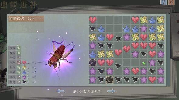 總共八項屬性,我們需要從各個角度各個方向來觀察蟋蟀,憑借多場游戲的經驗,才能較為精準地評測出一頭蟋蟀真實的戰斗能力。