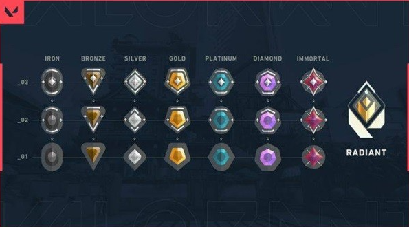 圖中明顯能看出和《Valorant》和同為Riot開發(fā)的《英雄聯(lián)盟》段位排布相差無幾,最低黑鐵、白銀,到最高的鉆石和大師(暫譯,Immortal),前七種段位每個(gè)還包括三個(gè)小段位,所有段位之上名為“Radiant”(可理解為天輝、耀光)。原文解釋原本最高段位想要稱呼為“Valorant”以彰顯該游戲排名的獨(dú)有性,后為了防止與游戲名混淆而改為“Radiant”。