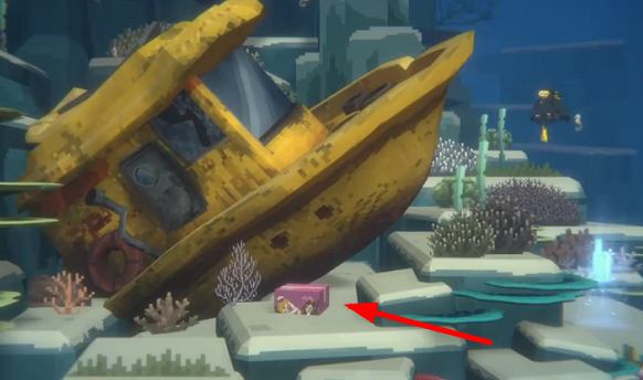 2、在海底的黃色沉船處我們可以看見一個粉色快遞盒。