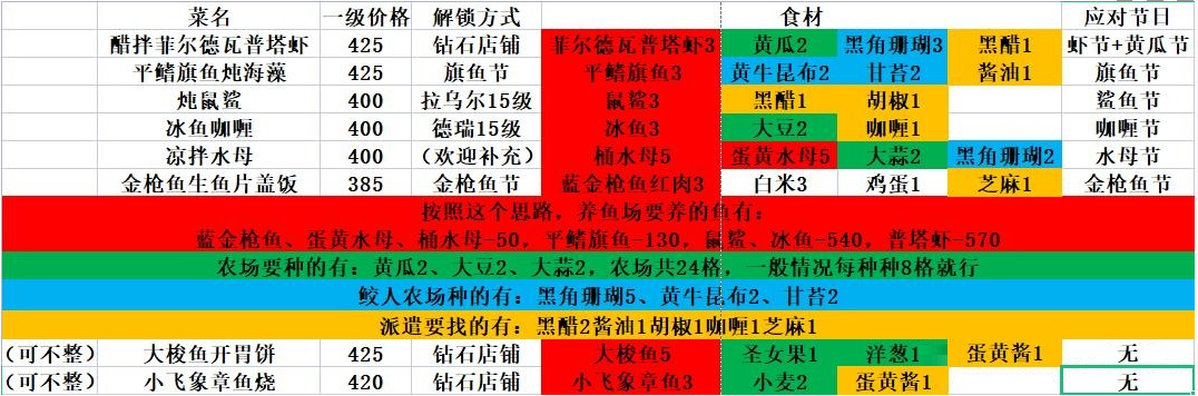 思路是,黃瓜串隕落后,料理應當應付日常+節日兩種情況,所以我找出所有節日對應的最貴的料理(因為未考慮成本所以不一定是最賺錢的料理,歡迎討論補充),而正好其中包括了425檔位的日常最貴料理。所以我認為把應對七大美食節的六種料理全部升滿,日常也可以賣其中有富余的,這樣就可以應對所有情況。