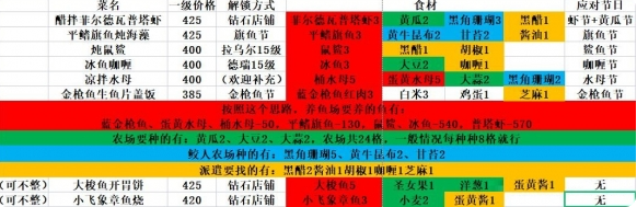 思路是:黃瓜串隕落后,料理應(yīng)當(dāng)應(yīng)付日常+節(jié)日兩種情況,所以我找出所有節(jié)日對應(yīng)的最貴的料理(因為未考慮成本所以不一定是最賺錢的料理,歡迎討論補充),而正好其中包括了425檔位的日常最貴料理。所以我認(rèn)為把應(yīng)對七大美食節(jié)的六種料理全部升滿,日常也可以賣其中有富余的,這樣就可以應(yīng)對所有情況。