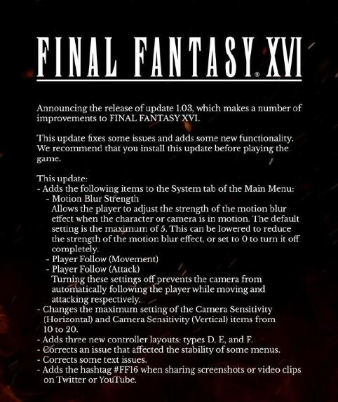 SE發布了最終幻想16的1.03版本更新,修復了一些問題并添加了一些新功能,現在玩家可以在設置中調整動態模糊的強度了,以下是更新要點: